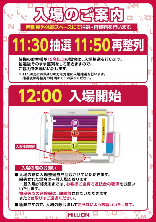 8:45までにお集まりください。待機のお客様が15名以上の場合は入場抽選を行います。 |