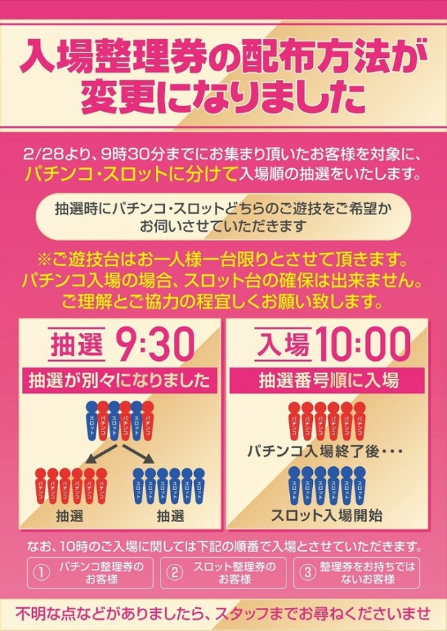 9時50分までにお集りのお客様を対象に、パチンコ、スロットに分かれて入場順番の抽選を致します。 |