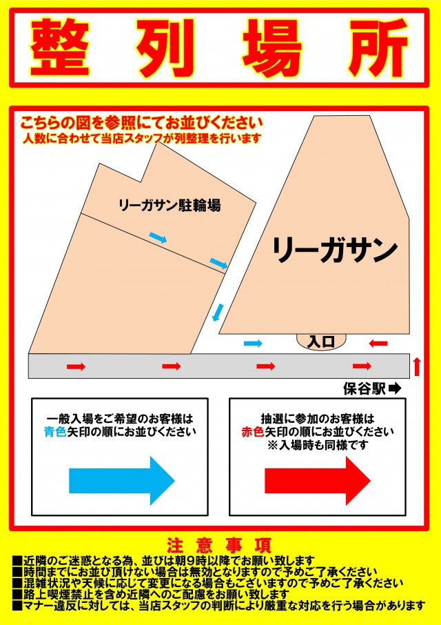 通常時は並び順になります。新装開店など一部ご案内のある日は抽選入場とさせていただきます。詳しくはホームページやプッシュ通知などをご確認ください。 |