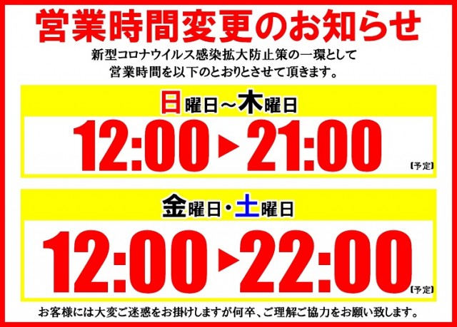 明日から営業時間変更 10時~22時50分まで営業