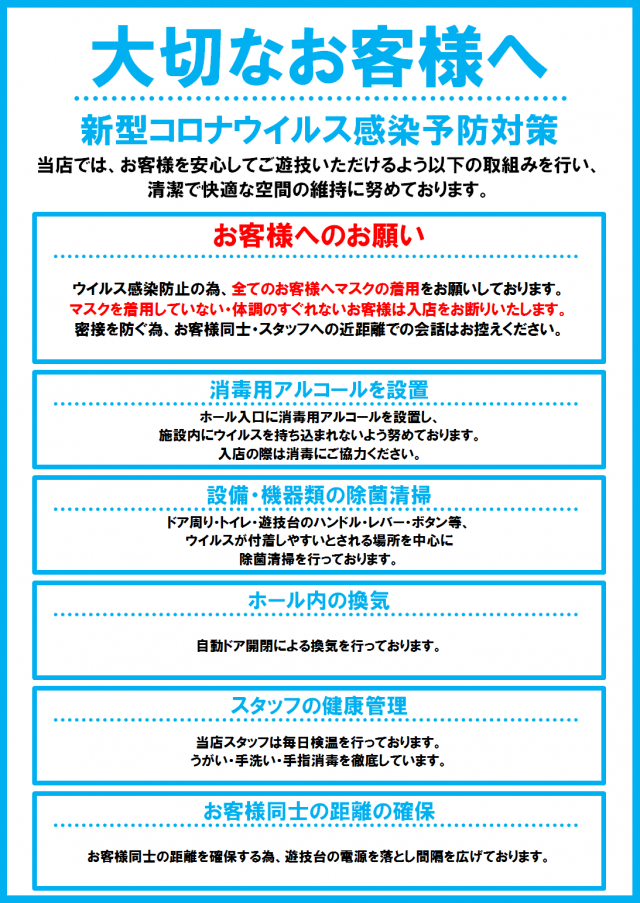 ①営業中は遊技台や店内設備の定期的消毒を行います