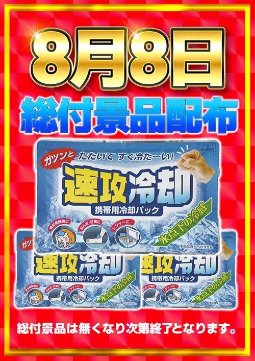 8月8日総付景品配布 朝の入場は抽選入場