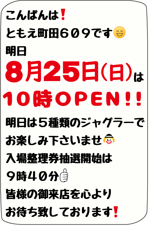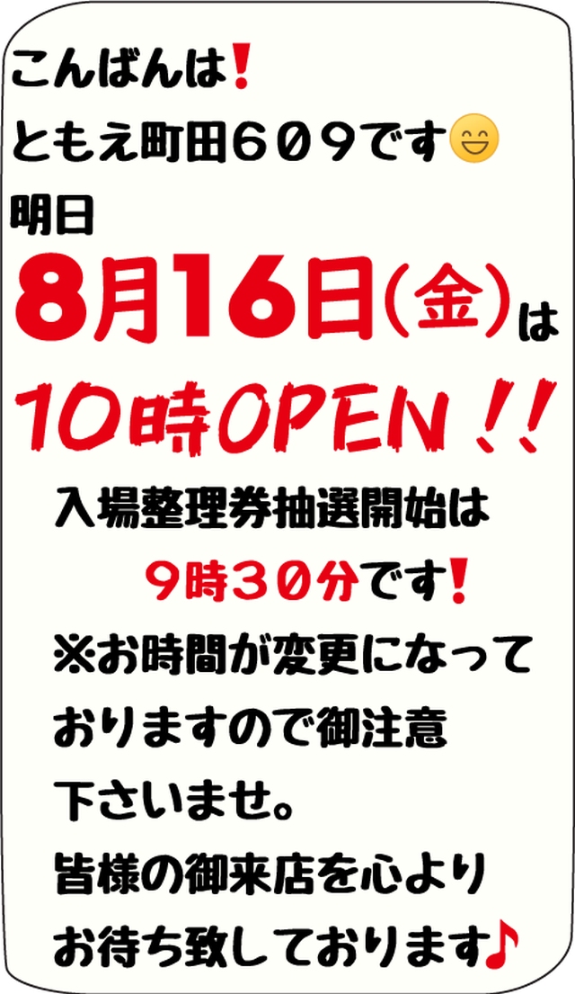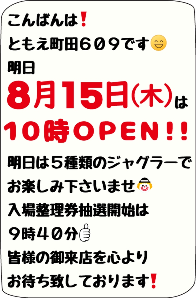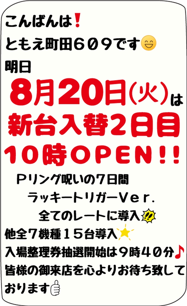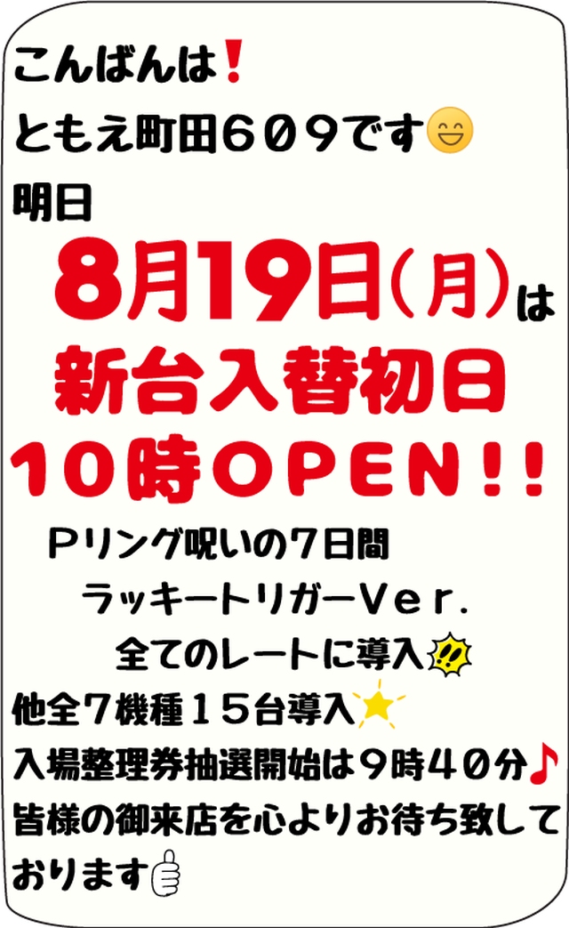 【ともえ町田609】8月19日新台入替10時OPEN!!