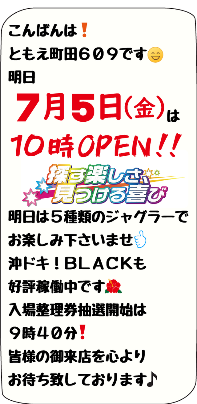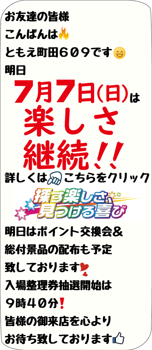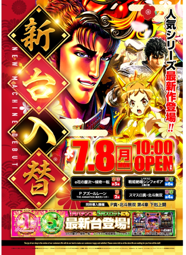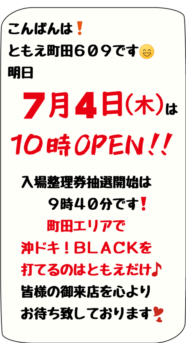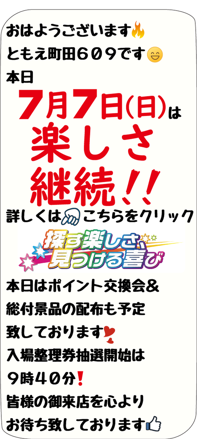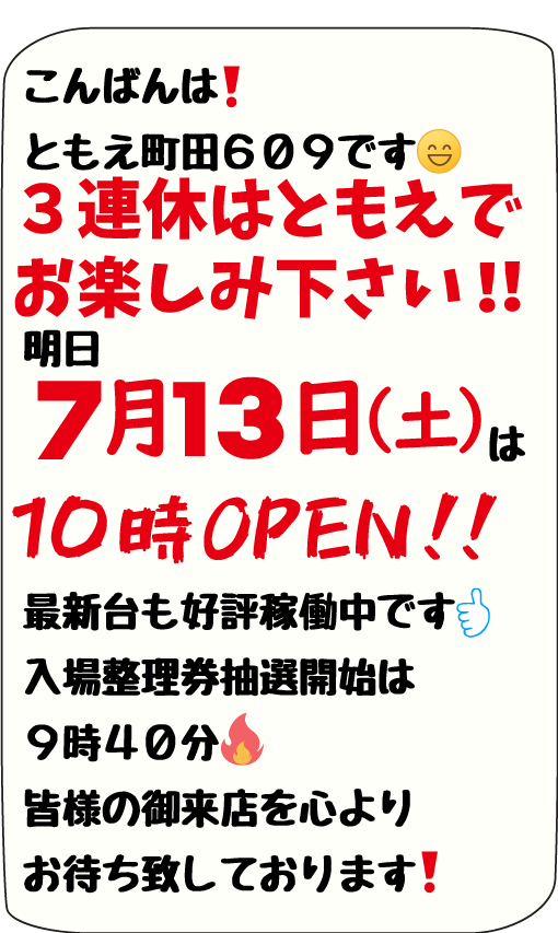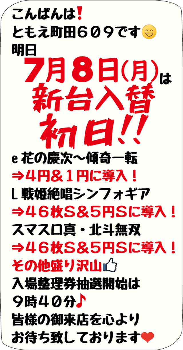 【ともえ町田609】7月8日(月)新台入替10時OPEN!
