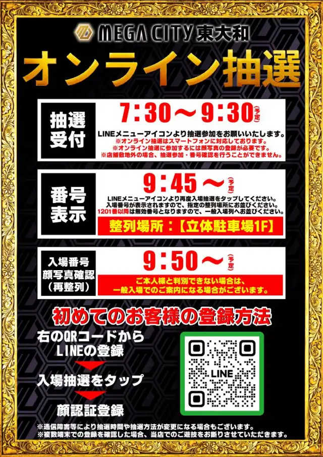 朝9:40までに駐車場1階へお集まり頂いたお客様で入場抽選を行います。抽選が終わり次第すぐ再整列となります。 |