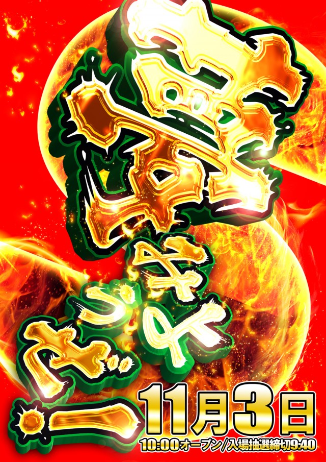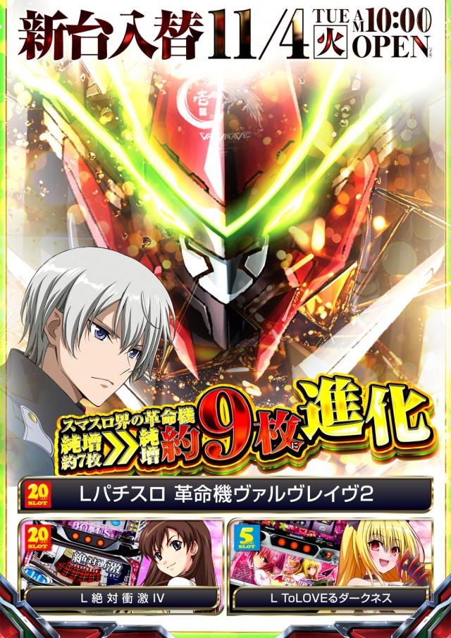 11月4日-新台入替-入場抽選締切9:50です20円スロット新台・L 革命機ヴァルヴレイヴ2/3台・L 絶対衝撃Ⅳ/1台20スロ最新台ご希望の方は1Fサービスカウンターへ11:30までにお越しください5円スロット新台・L ToLOVEるダークネス/1台5スロ新台は開店時より お楽しみ頂けます -