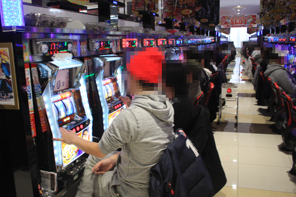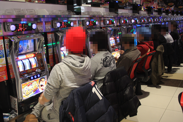 ジャグラーシリーズにも大勢のプレイヤーがおり、とくに「マイジャグラーⅡ」には空き台が見られなかった。
