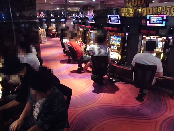 午後の21.27円パチスロでは、「バジリスク~甲賀忍法帖~絆」や「ミリオンゴッド-神々の凱旋-」が大盛況。うれしそうに笑みを浮かべるプレイヤーも確認でき、各シマが明るい雰囲気につつまれていた。