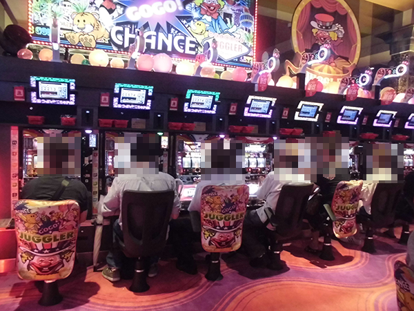午後になっても、21.27円パチスロの「バジリスク~甲賀忍法帖~絆」が目を引かれてしまうほどに盛況。ポテンシャルを発揮できているといったプレイヤーがおり、シマ全体に魅力的な光景が広がっていた。