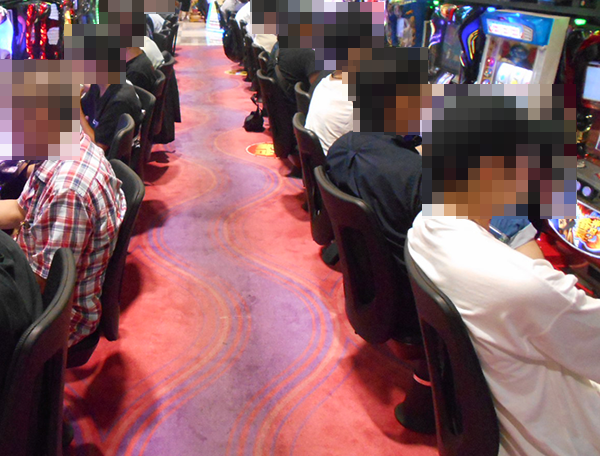 午後の21.27円パチスロはコーナー全体が高稼働。満席に近い光景は壮観であり、各シマが活気づいていた。