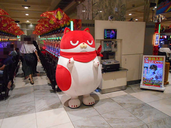 ホールの公式キャラクターであるにゃんまるの姿もあり、ふれあいを楽しむプレイヤーも目にしている。