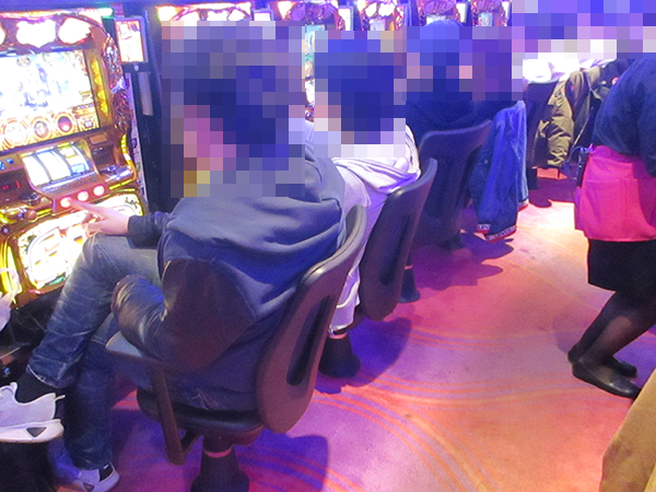 AT・ART機やボーナスタイプを問わずに、さまざまな機種に笑顔でレバーを叩いている姿があった。