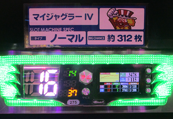 設置台数は16台で、16時の時点で5台が30回以上のボーナスに当選。そのうちの4台はボーナス合算確率が設定6の数値を上回っていた。