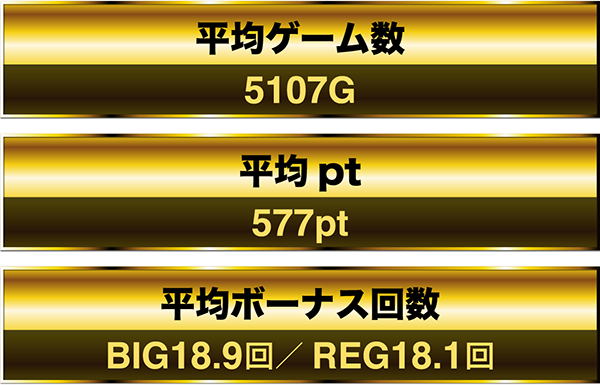 最終的な平均ゲーム数は5107G。平均ボーナス回数はBIGとREGをあわせて37回であった。