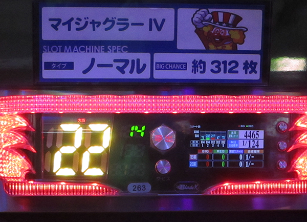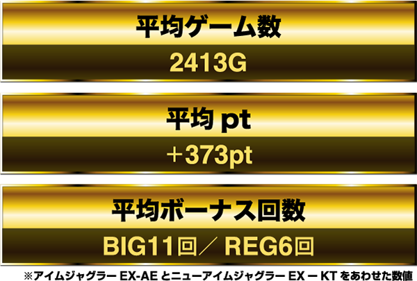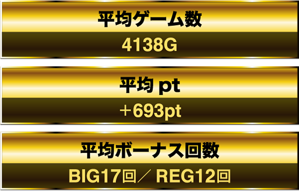 1日を通した平均ゲーム数は4138G。平均ボーナス回数はBIGとREGをあわせて約29回であった。