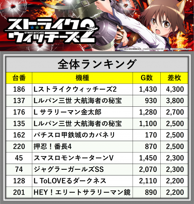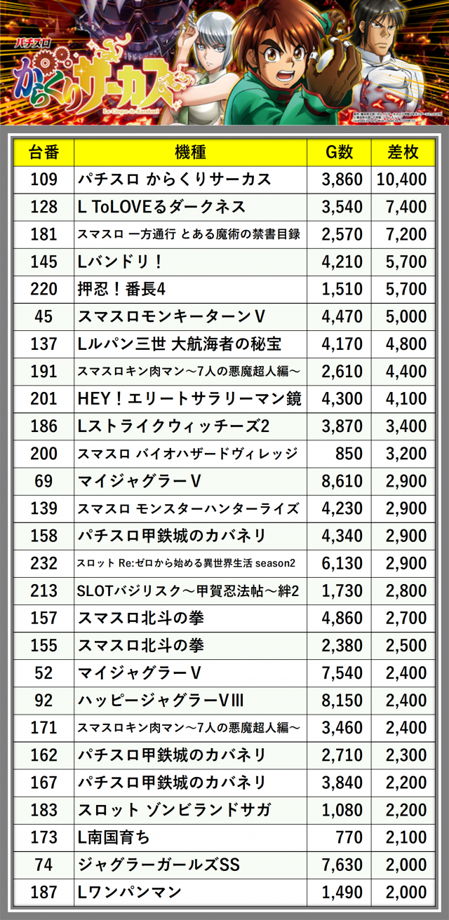厳選された取材対象機種をはじめ、その他スロット全体から好記録が飛び出した!プレイヤーが楽しんだ1日を下記データにて振り返ってみて欲しい。