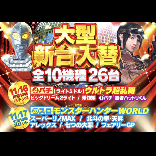 11月16日(パチンコ)17日(スロット)大型新台入替❗❗
