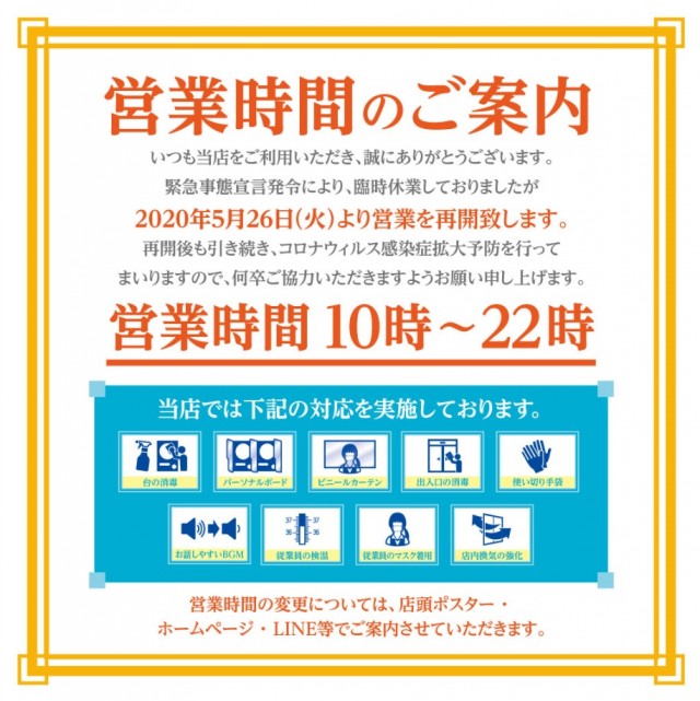 本日より営業を再開致します。ご来店お待ちしております。