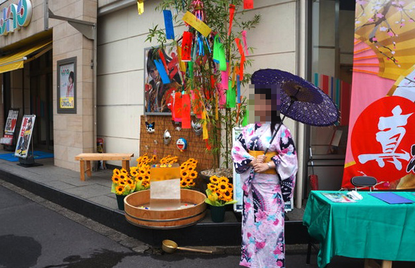 七夕ということもあり、店頭には大きな笹が置かれ、浴衣姿の女性スタッフがプレイヤーをお出迎え。