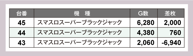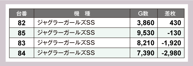 続いて合同PICK UP機種の状況を見ていくと、『スマスロスーパーブラックジャック』からは+2,000枚が発生。ゲーム数も6,000Gを超えており、しっかりと粘ってその実力を引き出すことに成功している。また、『ジャグラーガールズSS』も軒並み7,000Gを超える高稼働をぶりを披露。ファンにとっては本機の魅力を存分に味わえた一日となったはずだ。