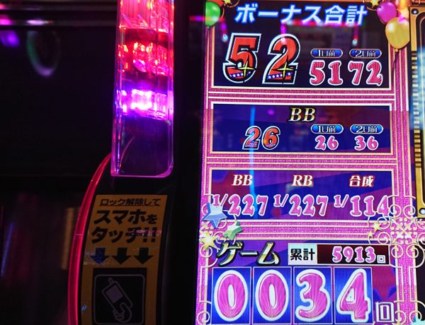 高設定域からボーナス確率が落ちることはなく、朝イチから1万回転到達の道のりは遠まわりが続いていた。