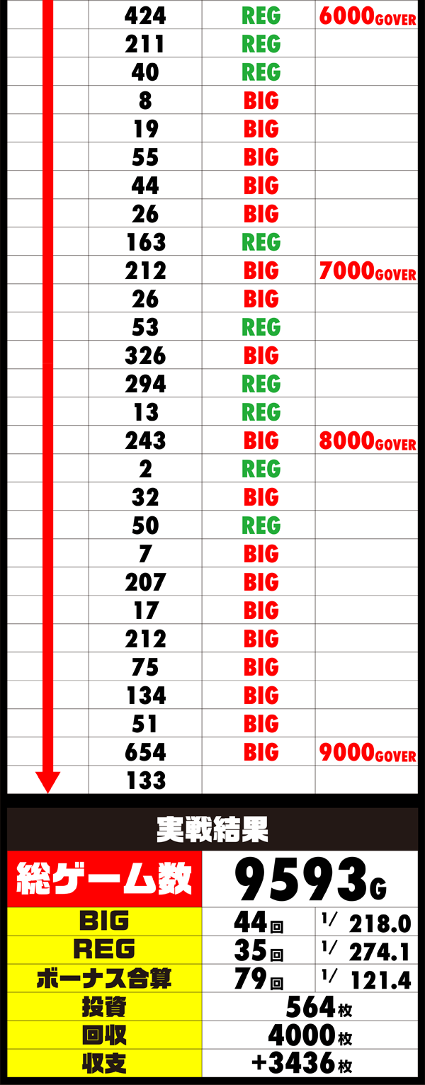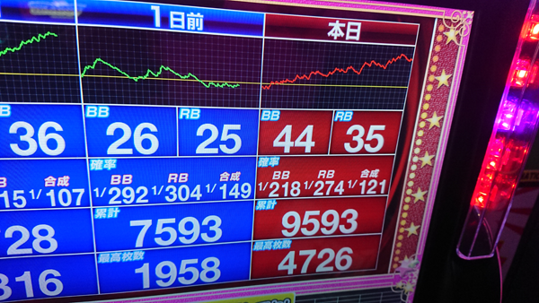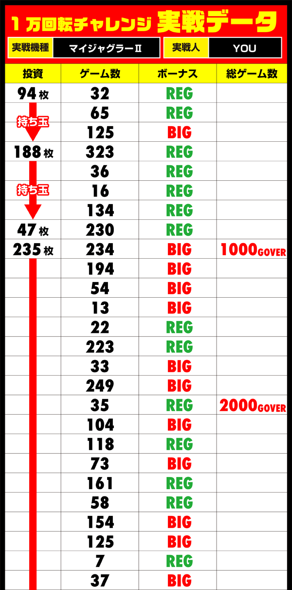 REGが先行するも、純粋に多くなったボーナス回数がタイムロスにつながり、「マイジャグラーⅡ」の通常時を消化するペースはイマイチ。