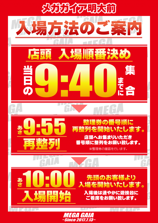 当店抽選方法は、オンラインにて8:00~9:00までに受付締切、9:50に整列となります!!! 詳細は店舗公式ライン登録から入場くんへ!! |