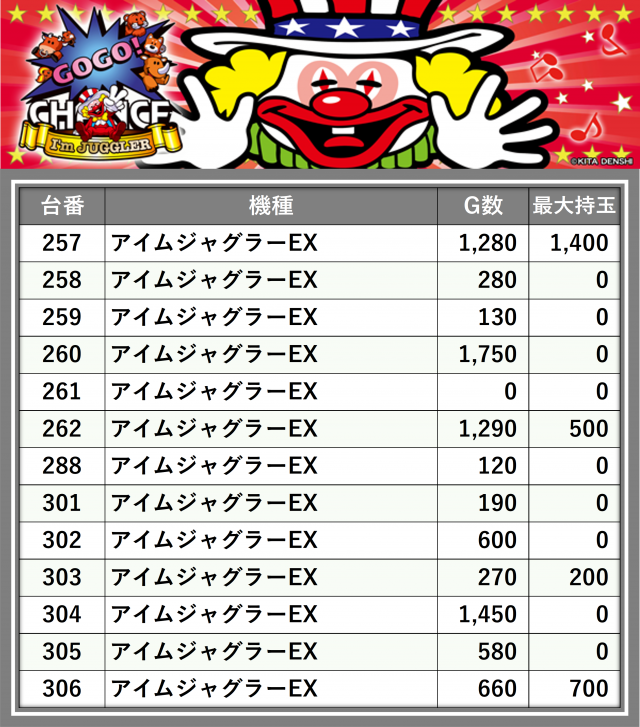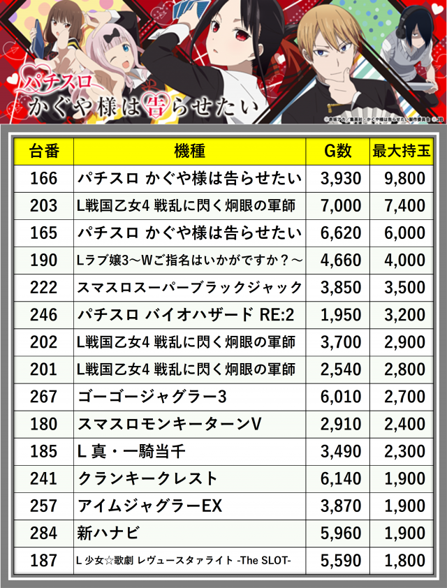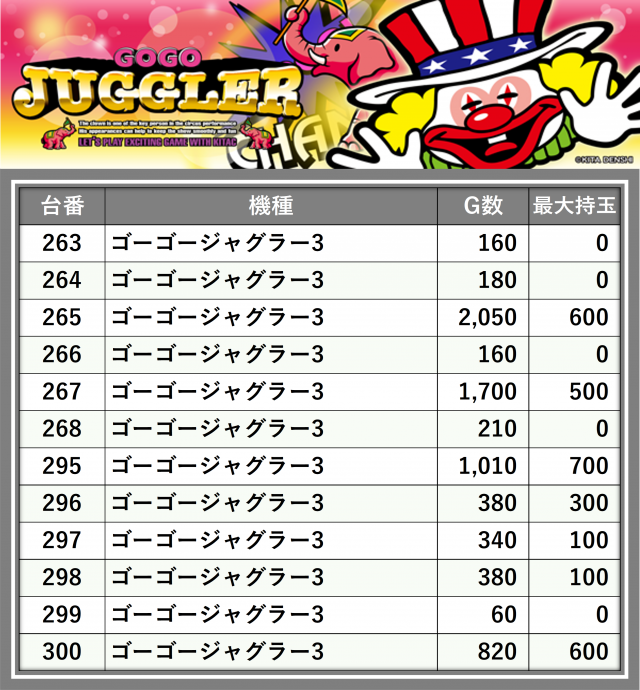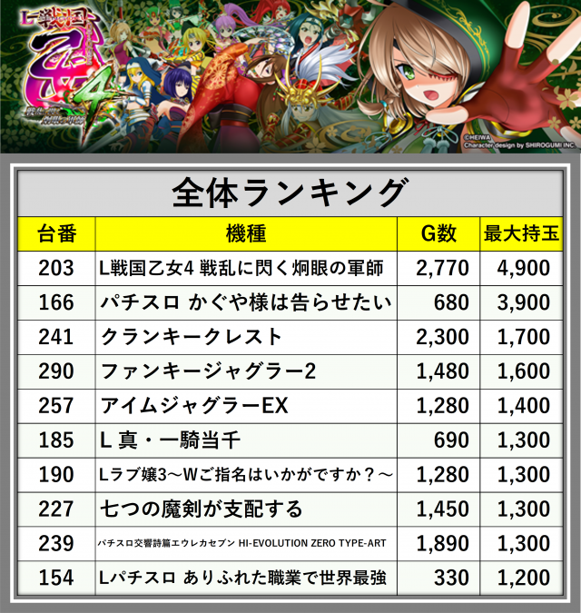 厳選された取材対象機種をはじめ、その他スロット全体から好記録が飛び出した!プレイヤーが楽しんだ1日を下記データにて振り返ってみて欲しい。
