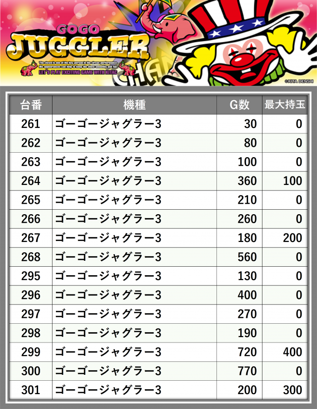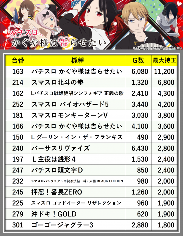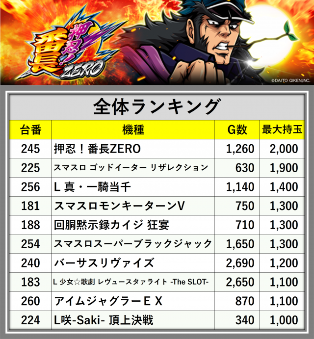 厳選された取材対象機種をはじめ、その他スロット全体から好記録が飛び出した!プレイヤーが楽しんだ1日を下記データにて振り返ってみて欲しい。