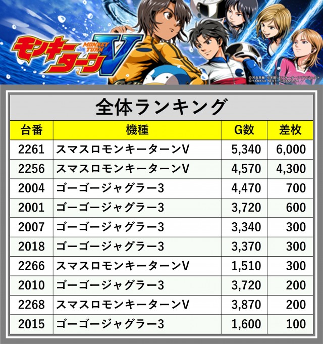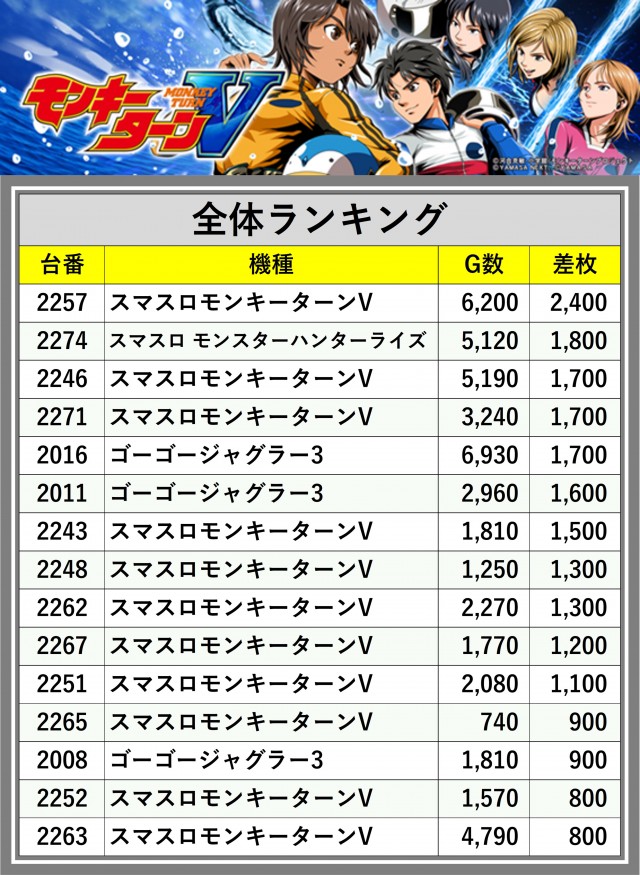 厳選された取材対象機種をはじめ、その他スロット全体から好記録が飛び出した!プレイヤーが楽しんだ1日を下記データにて振り返ってみて欲しい。