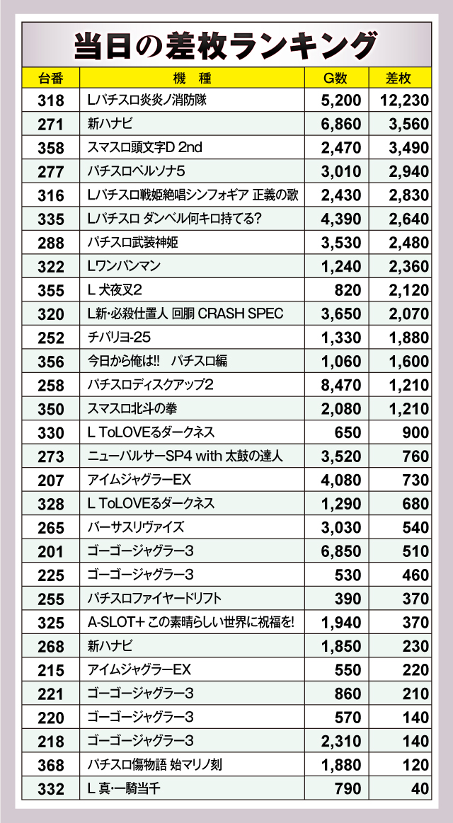 まずは当日の差枚ランキングを紹介していこう。30台のうち14台が差枚+1,000枚オーバーで、+2,000枚オーバーは10台出現。それらのなかでもっとも優秀だった台は、318番台の「Lパチスロ炎炎ノ消防隊」で、差枚は大台突破の+12,230枚と素晴らしい結果をマーク! その他ランクイン機種を見渡すと、スマスロ人気機種をはじめ、「ゴーゴージャグラー3」も複数台がランクイン。チャンスは店内のアチコチに隠されていた可能性が高そうだ!