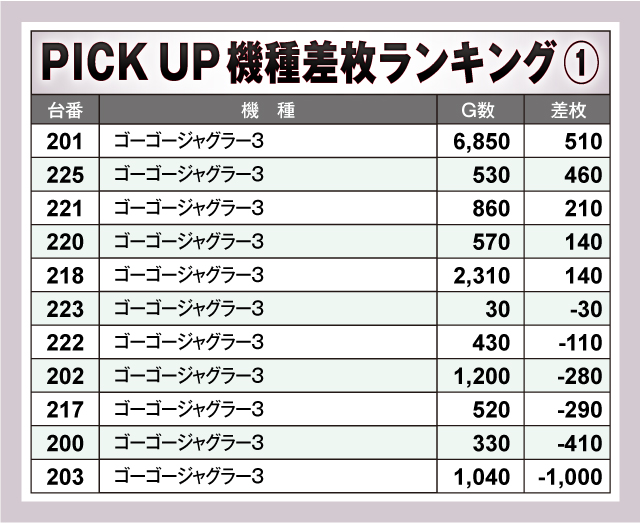 続いては、当日とくに店内を盛り上げた「ゴーゴージャグラー3」を紹介していこう。ピックアップ11台のうち5台がプラス差枚で終了しており、またその他多くの機種からも良台を複数確認することができた! 楽しめる機種はアチコチに出現していたようだ!
