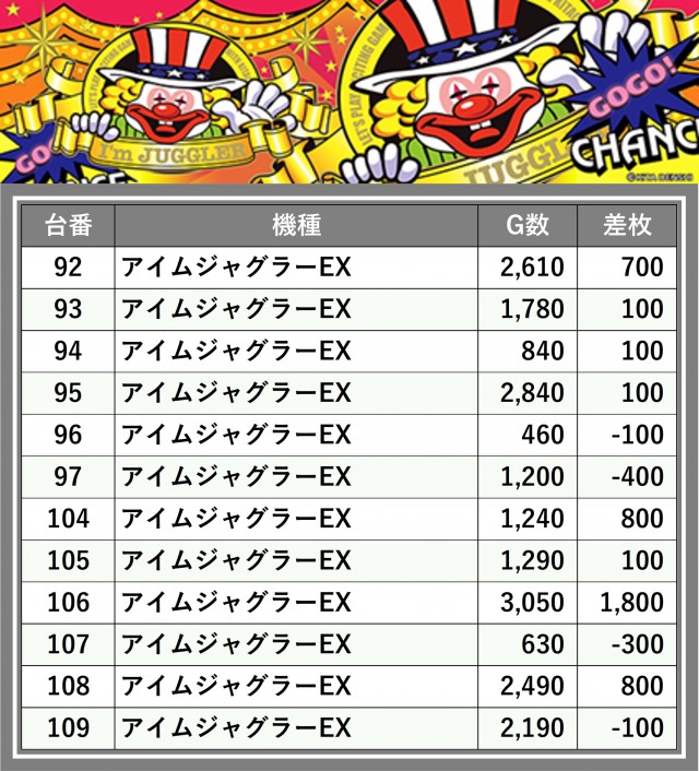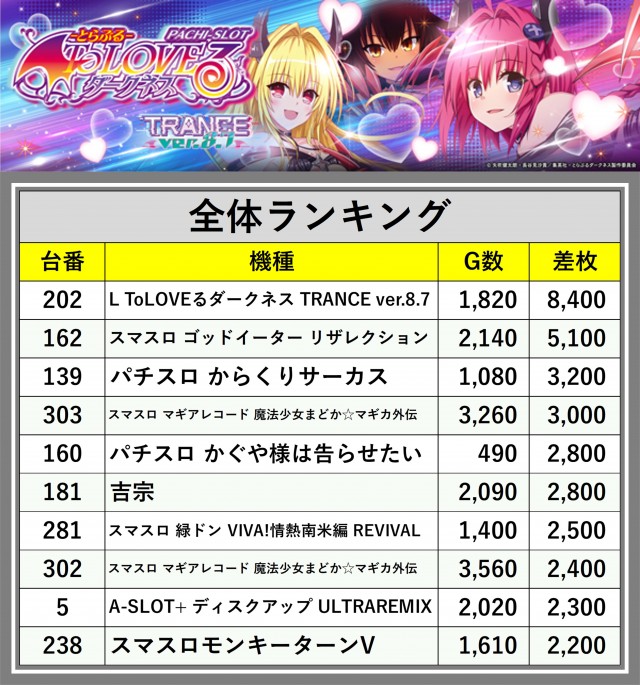 厳選された取材対象機種をはじめ、その他スロット全体から好記録が飛び出した!プレイヤーが楽しんだ1日を下記データにて振り返ってみて欲しい。
