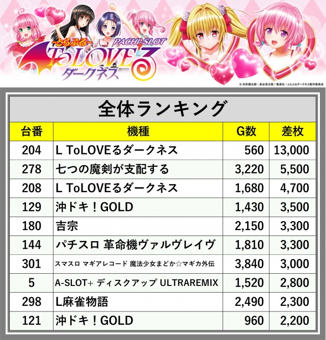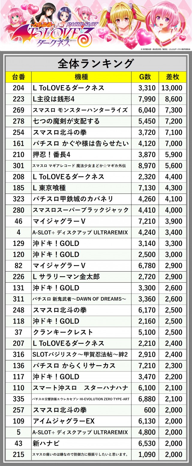 厳選された取材対象機種をはじめ、その他スロット全体から好記録が飛び出した!プレイヤーが楽しんだ1日を下記データにて振り返ってみて欲しい。