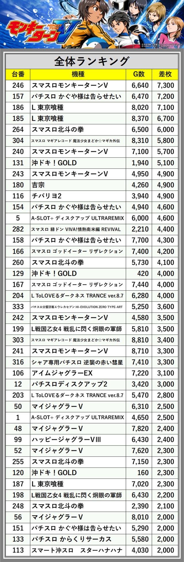 厳選された取材対象機種をはじめ、その他スロット全体から好記録が飛び出した!プレイヤーが楽しんだ1日を下記データにて振り返ってみて欲しい。