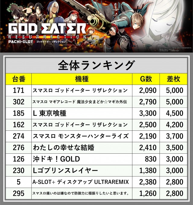 厳選された取材対象機種をはじめ、その他スロット全体から好記録が飛び出した!プレイヤーが楽しんだ1日を下記データにて振り返ってみて欲しい。