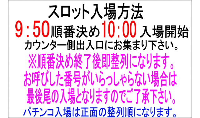 スロット9:50より入場順番決め開始!パチンコ並び順での入場となります。 |