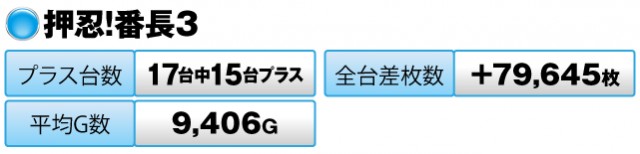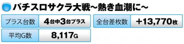パチスロは453台中プラスが187台で、トータルの差枚数は+138,73枚という好結果を残して幕を閉じた。『押忍!番長3』の驚異的な出玉を筆頭に、数多くの英雄が誕生した一日であった。