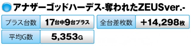 『アナザーゴッドハーデス-奪われたZEUSver.-』は、17台中9台がプラスで、全台差枚数は+14,298枚。