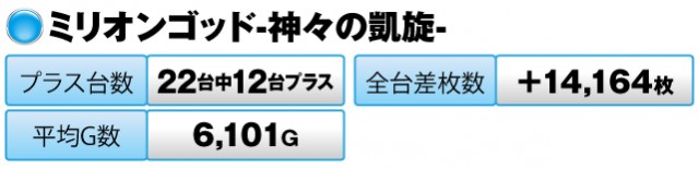 一方、『ミリオンゴッド-神々の凱旋-』も、22台12台がプラスで、全台差枚数は+14,164枚をマークしている。