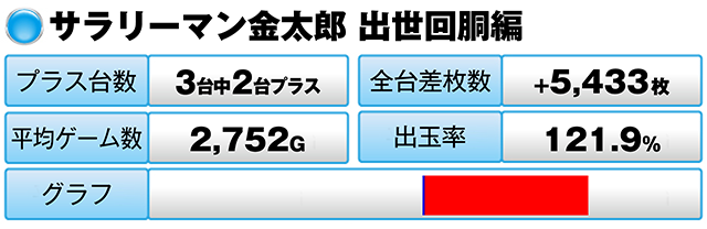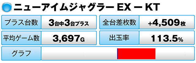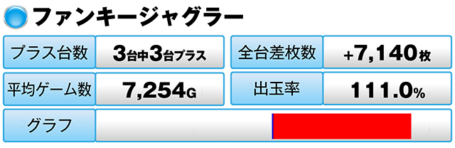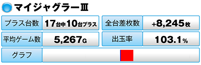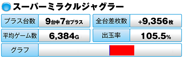 『スーパーミラクルジャグラー』が9台中7台がプラスで全台差枚数は+9,356枚、『マイジャグラーⅢ』が17台中10台がプラスで全台差枚数が+8,245枚、『ファンキージャグラー』が3台すべてがプラスで全台差枚数が+7,140枚、『ニューアイムジャグラーEX-KT』が3台すべてがプラスで全台差枚数が+4,509枚という結果だった。