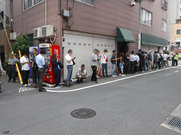 開店前から、約100名のプレイヤーが列を形成。各人とも遊技を待ちきれない様子であった。