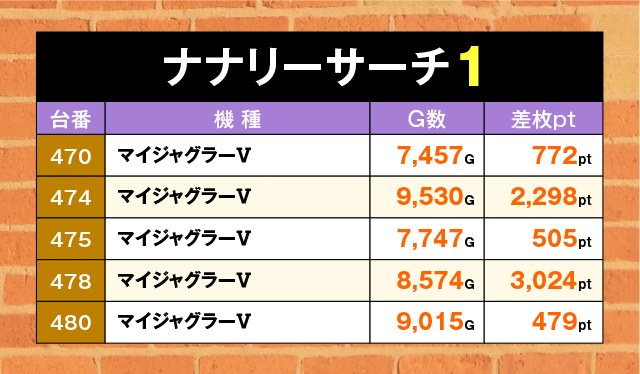バケに偏り、差枚1,000pt以下に終わった台がある反面、474・478番台は2,000ptオーバーを達成!