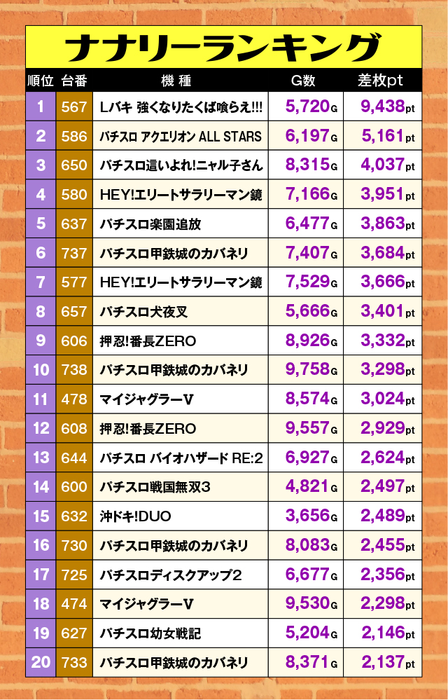 1万ptに迫る文句なしの大記録で『Lバキ 強くなりたくば喰らえ!!!』が首位の座に。『HEY!エリートサラリーマン鏡』『パチスロ甲鉄城のカバネリ』『押忍!番長ZERO』『マイジャグラーⅤ』の4機種は、それぞれ2台以上がランクイン!
