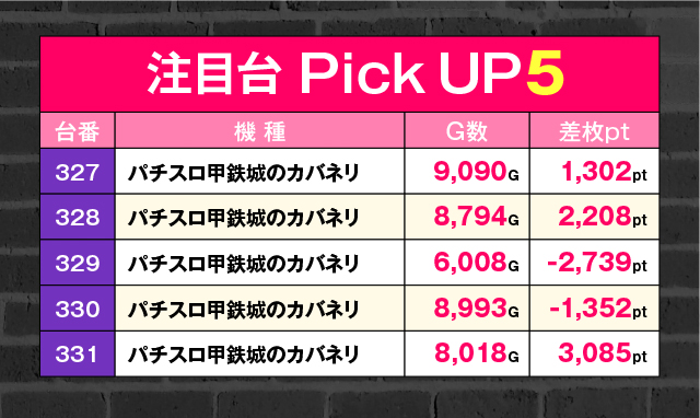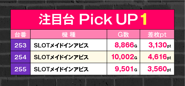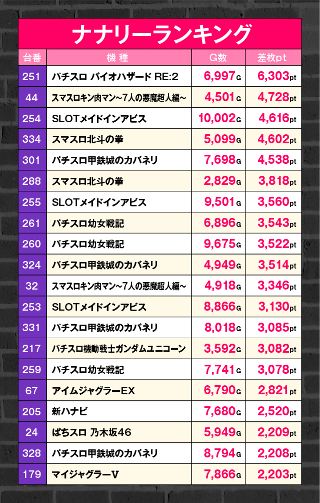 注目は全台系だった2機種『SLOTメイドインアビス』『パチスロ幼女戦記』の全台がランクインしていたということ。また今回は『スマスロ北斗の拳』がナリを潜め、その代わりに『スマスロキン肉マン~7人の悪魔超人編~』や『パチスロ甲鉄城のカバネリ』などの人気機種が複数台ランクインしてくれました!