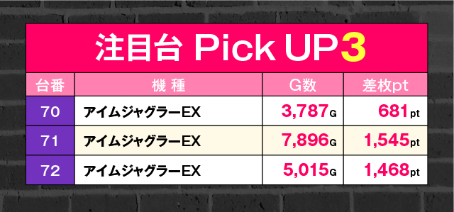 『アイムジャグラーEX』コーナーでは「並び」を目撃!昨日が73~75番台の並びだったので、ズラしてきたみたい。2日連続の調査だから、なんらかの法則でズラしてきたのかもね。