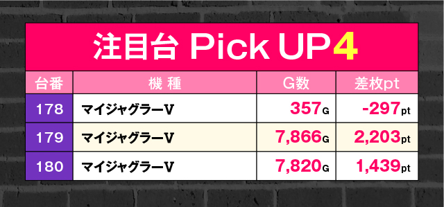 昨日と同じく『マイジャグラーⅤ』にも「並び」を発見!こちらも昨日とは違う3台並び。『アビス』と『幼女』が全台据え置きだったので、昨日の並びの3台に座った方は残念…。