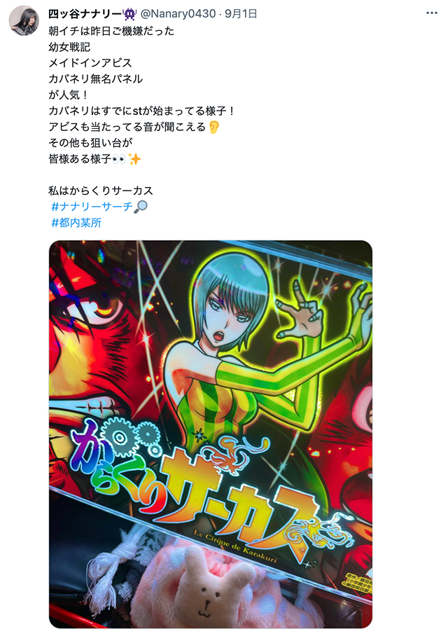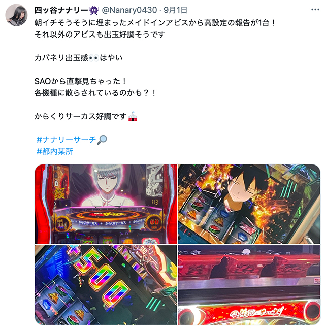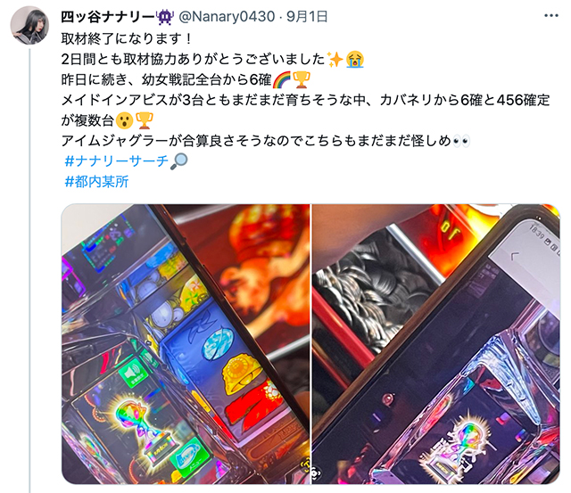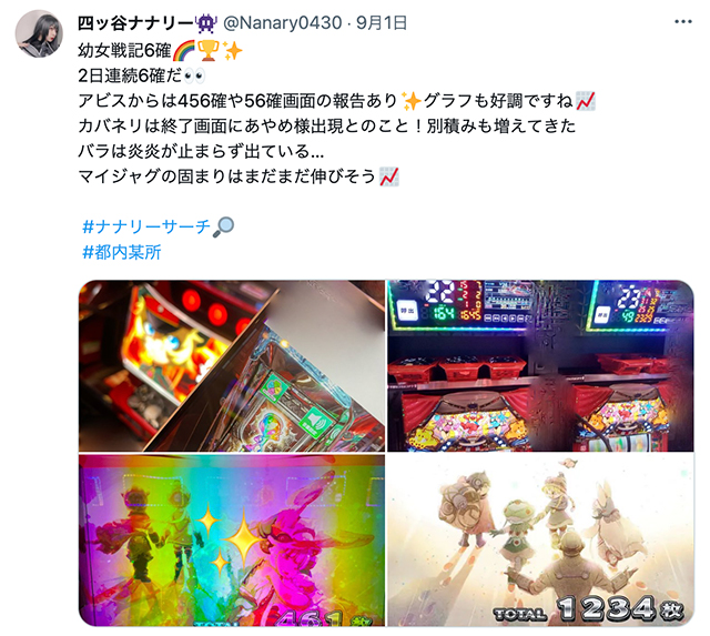 ナナリー:初の2日連続での実戦となった2日目のナナリーサーチ。アイムジャグラーからは前日以上の盛り上がりが感じられました。幼女戦記、メイドインアビスはまたまた全台系を感じさせる出玉を感じられ、全ての台がプラスだったように思います。また、カバネリもプラス台が多く、前日のことも考慮すると"据え置き"の傾向を予感させる結果だったように思います。