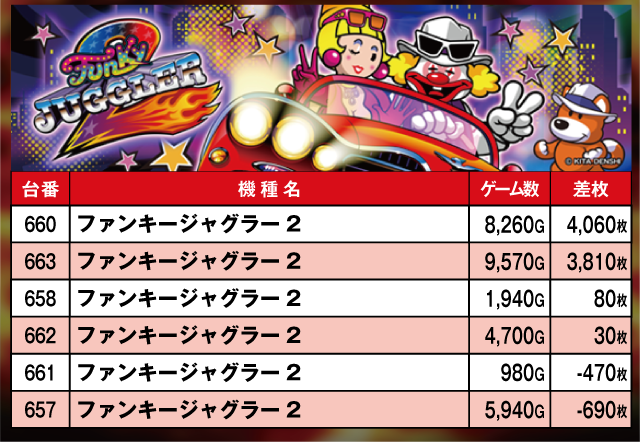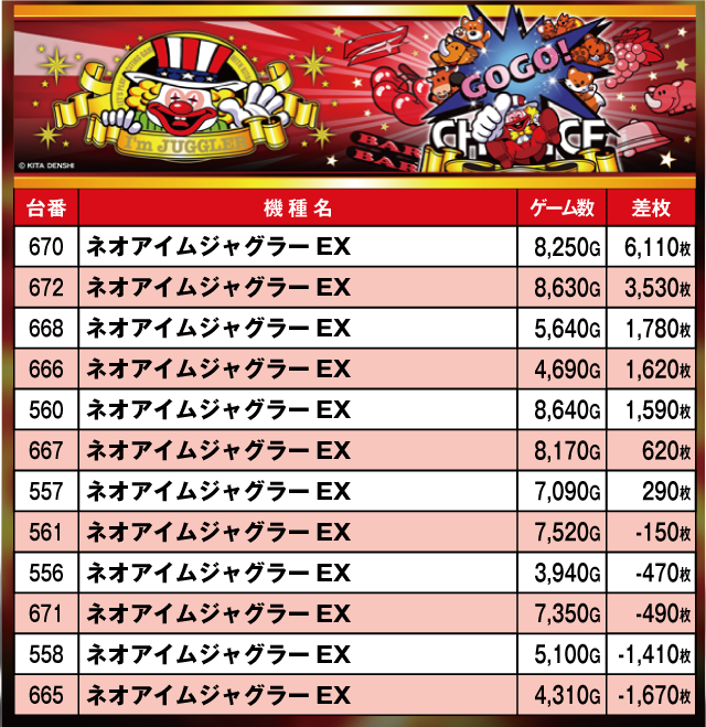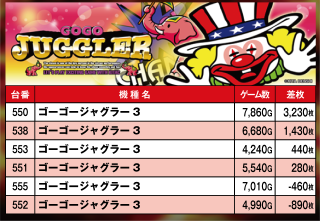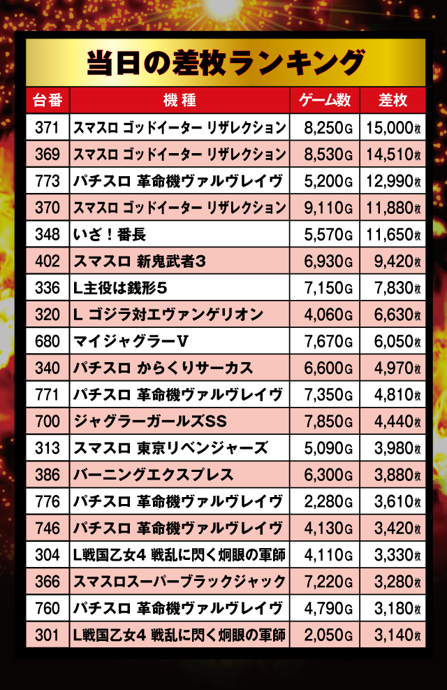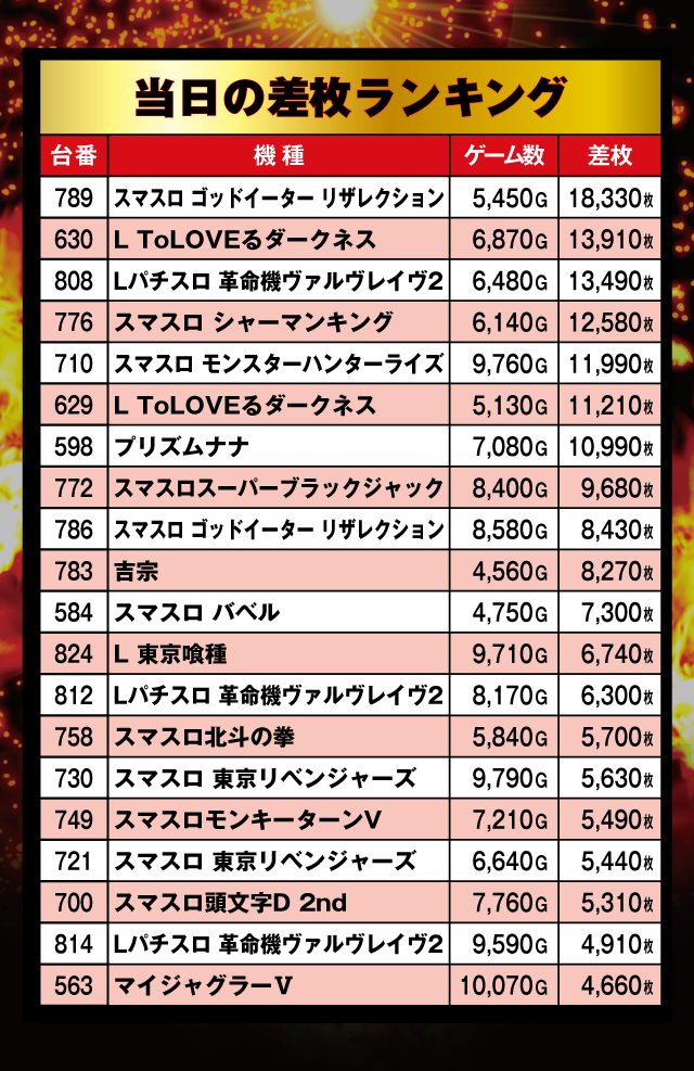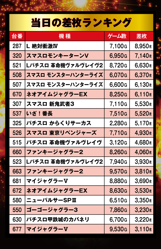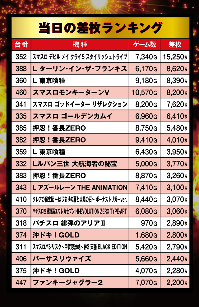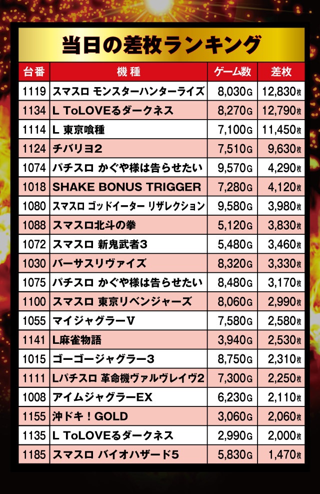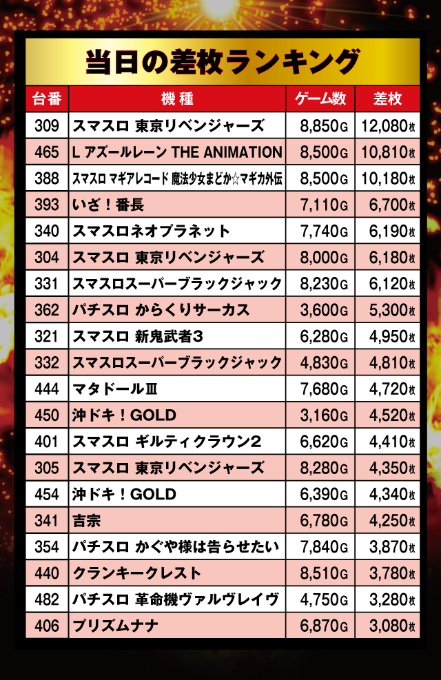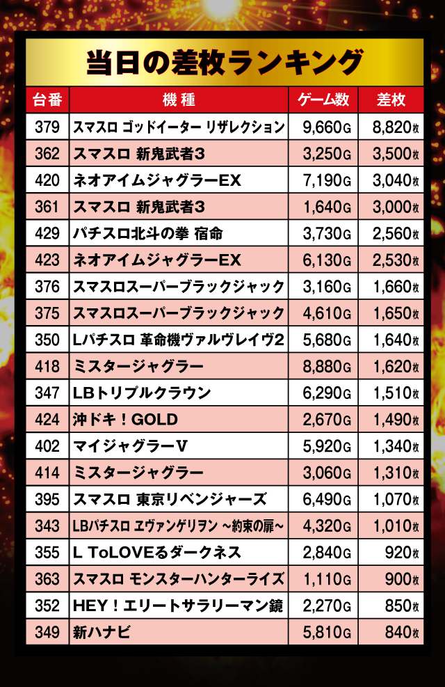 取材当日のしにせえず各店の華々しい結果の数々を、いち早く結果レポートとして公開。ぱちタウンが独自に選び抜いた機種たちと、各店の差枚ランキングに注目だ。データの詳細は以下を要チェック‼