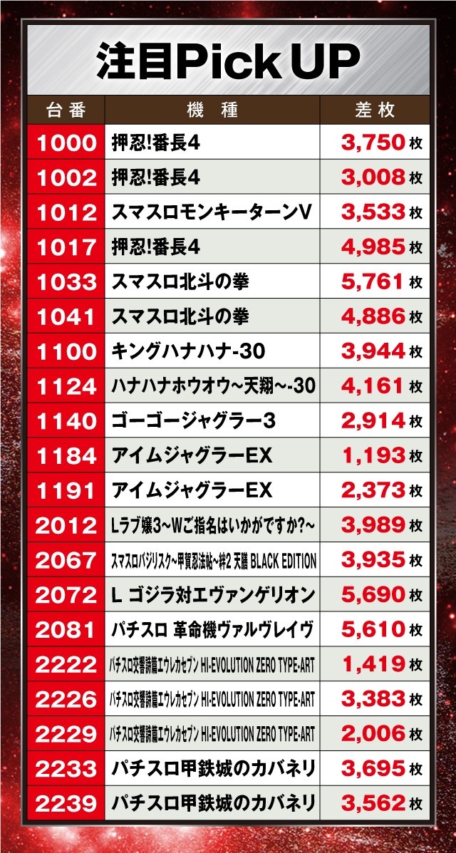 店内状況を見ると様々な場所で好調台が誕生しており、なんとその全台が+1,000枚以上のプラスと見事な結果を残している!
